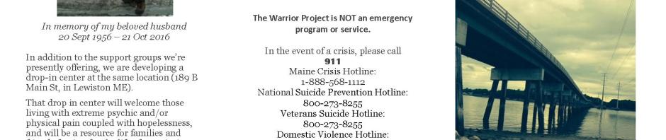 The Warrior Project is a warm, welcoming drop-in center for those living with extreme emotional and/or physical pain coupled with hopelessness, and a resource for families and friends fearing for the life of, or grieving the loss of, the person they love so much.