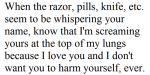 Again, a suicide. I only slightly know one of the family members but it is so similar to what I lived through two years ago, that all of the gamut of emotions came flooding back…. fear, hope, terror, more hope, and then… the horrific reality, that will stay with me for the rest of my days.